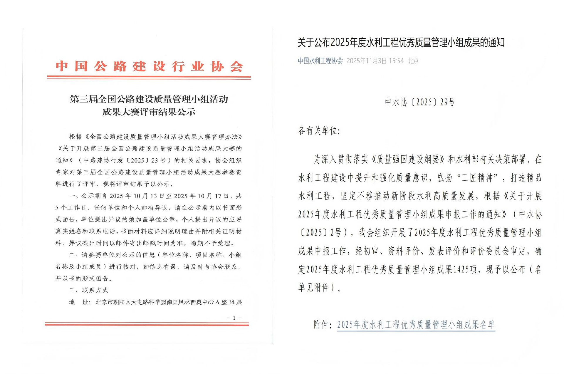 近日,中國公路建設行業(yè)協(xié)會、中國水利工程協(xié)會先后公布了第三屆全國公路建設質(zhì)量管理小組活動成果評審結(jié)果和2025年度水利企業(yè)質(zhì)量管理小組競賽活動結(jié)果。“···